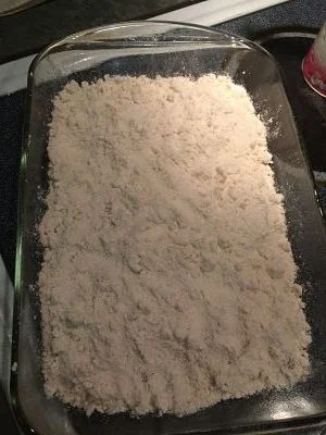 Spread (dump) the cake mix over the top of the fruit filling. Try to break of big clumps, but don’t worry about it too much.