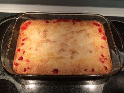 Bake for 30-40 minutes, until it’s golden brown on top. If you use a yellow cake mix it will be a nicer golden color. The white cake mix is kind of pale… but it tastes good!