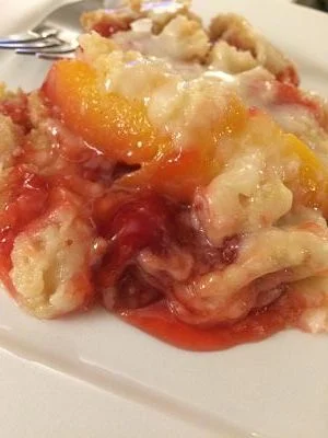 We did something a little different this time. We used a small can of cherry pie filling and a can of drained peach slices. In hindsight, we probably should have used a large can of pie filling. Pour (dump) the pie filling into the pan and then add the peaches on top of that.