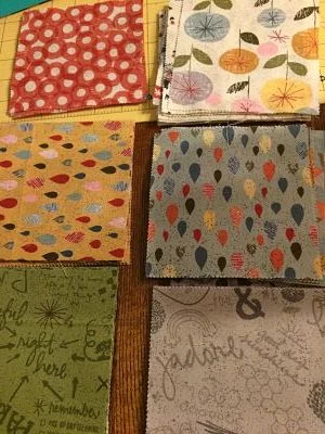 So I started at JoAnn’s. And I didn’t find anything that I loved. Nothing jumped out at me. My next stop was a newer quilt shop in town. I did find a collection there that had some green in it. And on top of that, it had fabric in it that incorporated words. (In case you’re interested, the collection is called “Mon Ami.”) So I picked up a charm pack and a few extra flat quarters. I chose the green fabric with words on it for the backing.