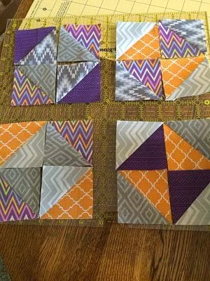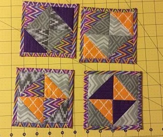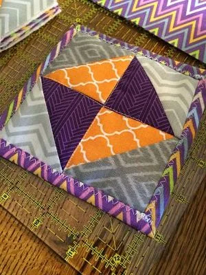 I only used four sets of triangles for each coaster. When it came to arranging the triangles, I did two coasters with the colors on the inside of the diamond shape and two with grey materials inside.